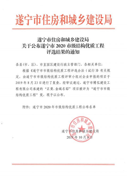 博弘建工承建項(xiàng)目榮獲“遂寧市市級(jí)結(jié)構(gòu)優(yōu)質(zhì)工程”稱號(hào)