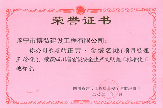 恭喜遂寧“正黃·金域名邸”項目再次獲獎,被評為“四川省省級安全生產(chǎn)文明施工標準化工地”獎稱號。